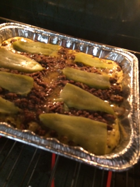 Cut your whole green chiles in half lengthwise and lay them down in the bottom of the pan to make a layer. Now add a layer of meat…then another layer of meat and finish with a layer of chiles on top. Let that hang out for a few minutes while you prep the eggs.